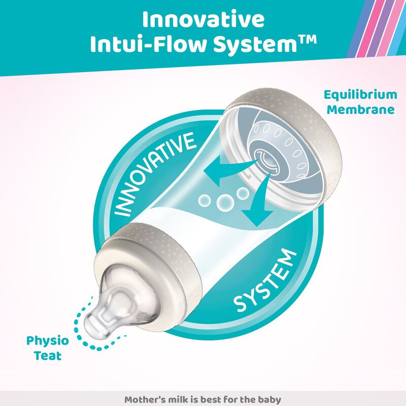 - Exclusive Intui-Flow System: The combined action of the equilibrium membrane and the physio teat (nipple) promotes an intuitive feeding, thus naturally adapts to the sucking force and feeding style of each baby which is unique