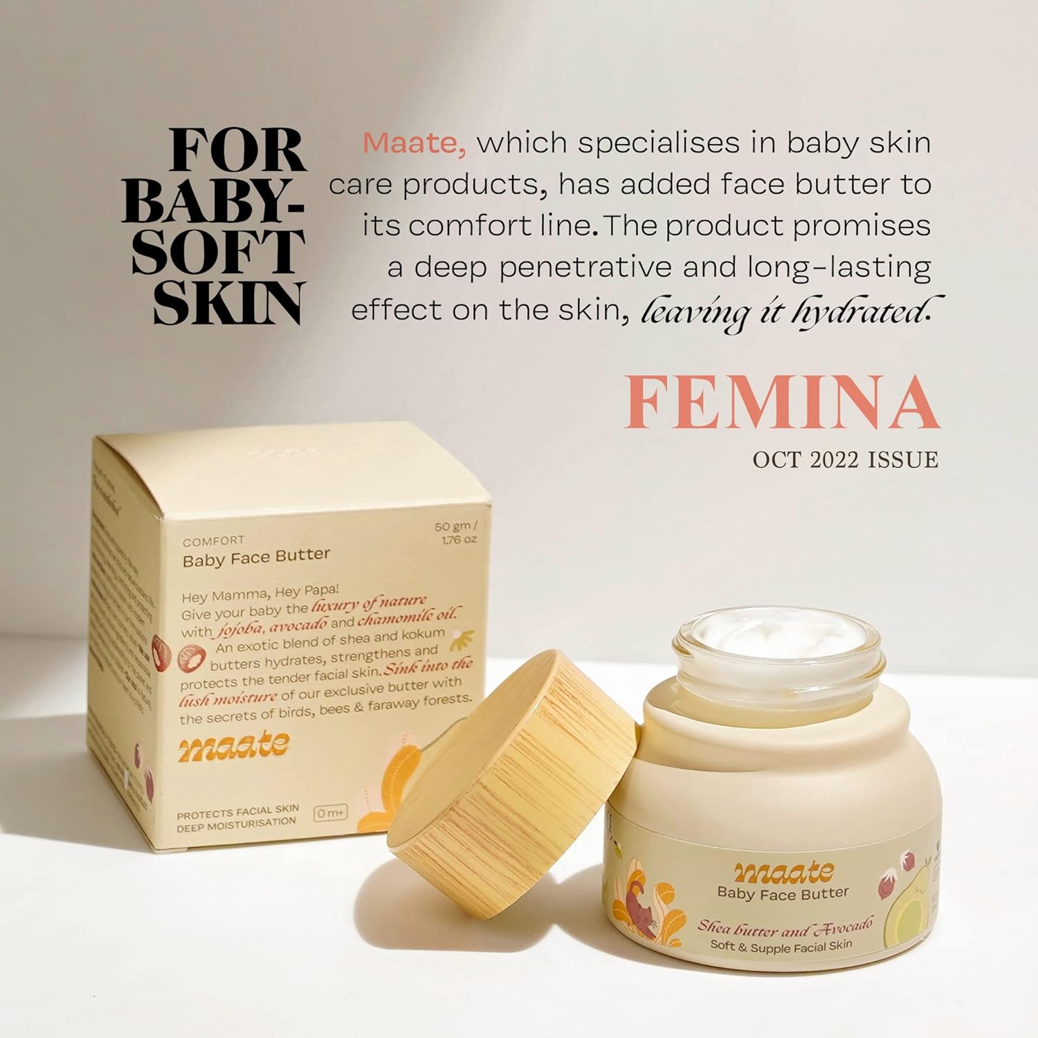 Experience Maate Baby Face Butter, enriched with Shea Butter and Avocado. It’s fast-absorbing, lightweight, deeply moisturizing, and protective. A natural, vegan choice, free from parabens.