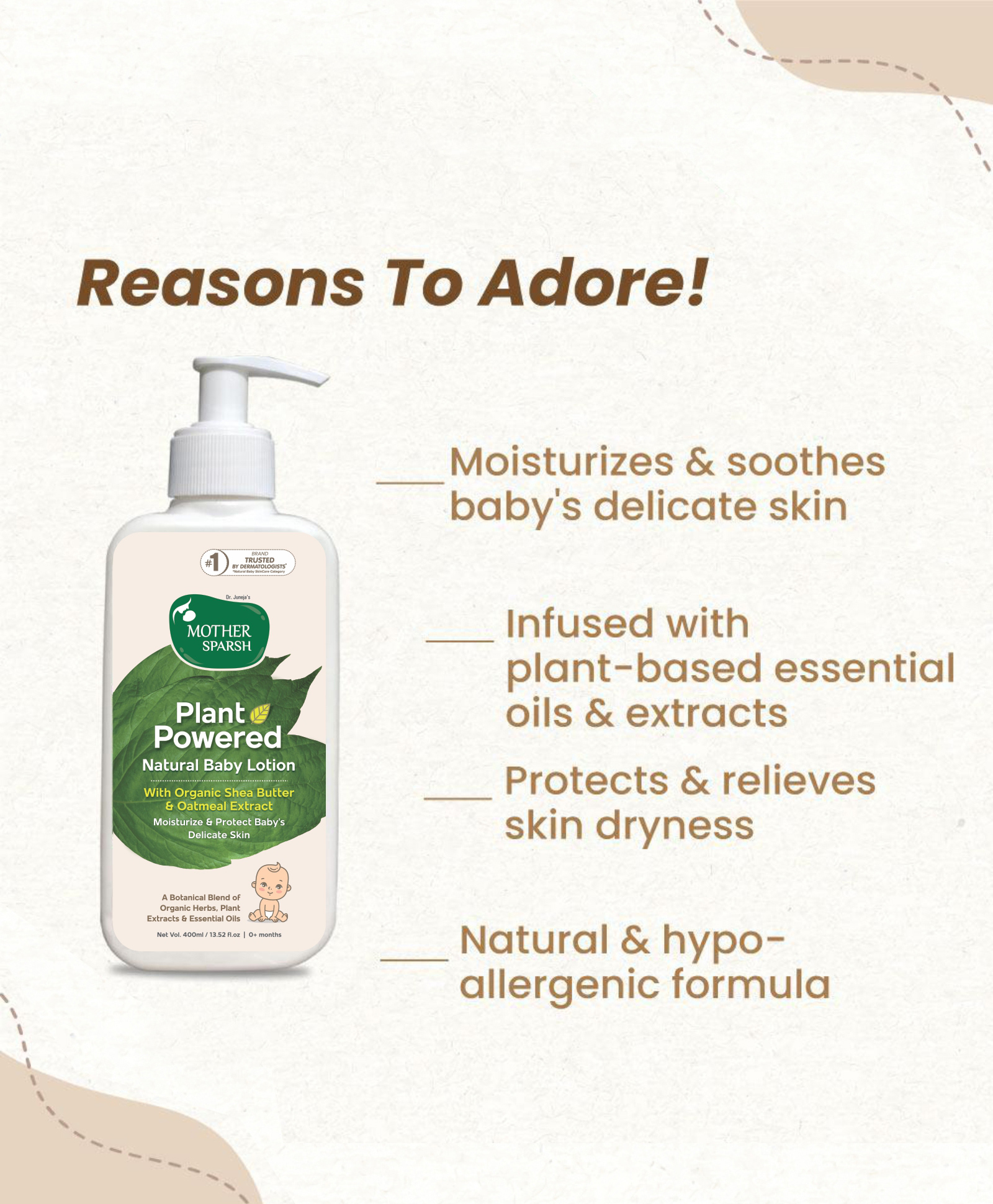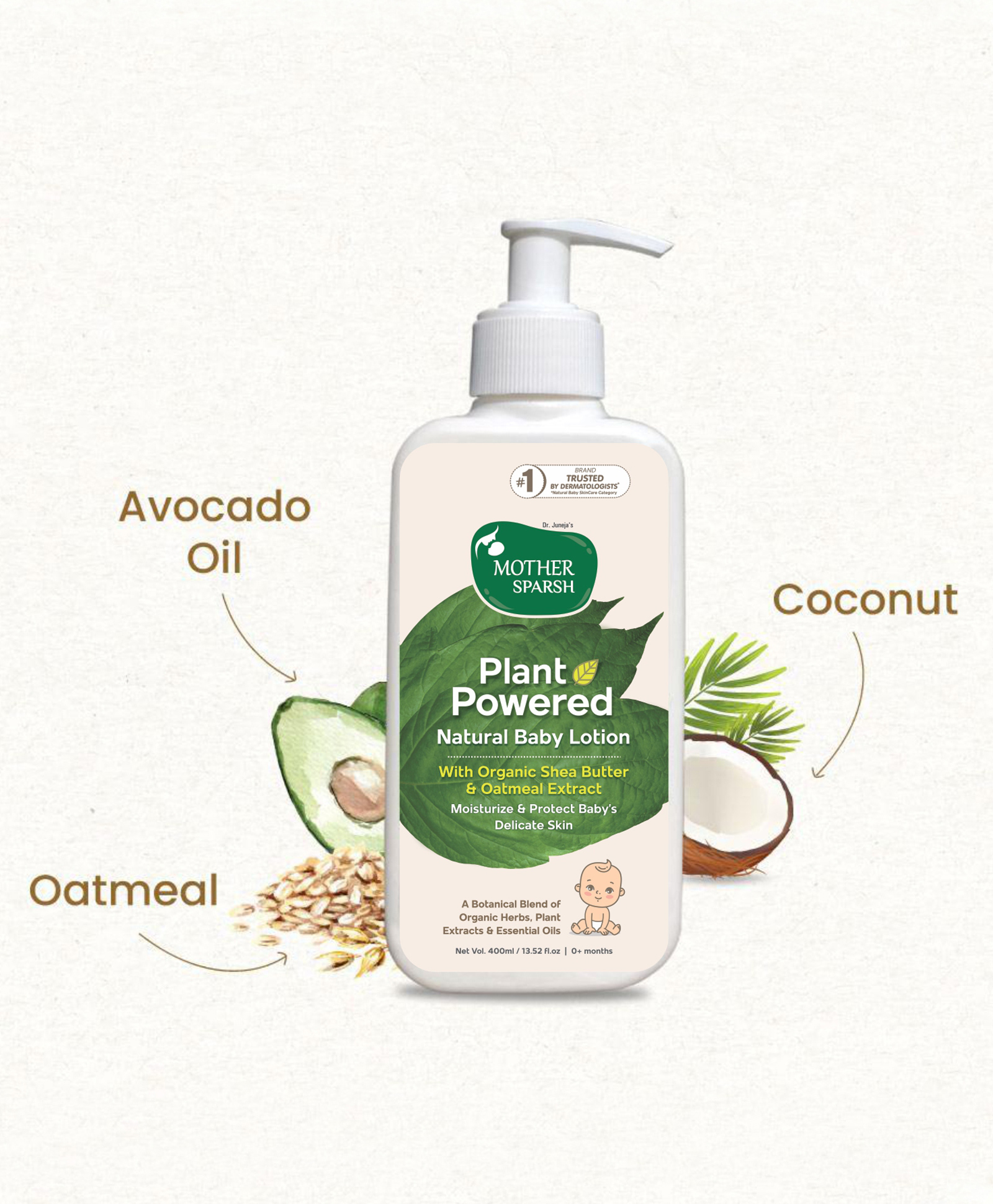 It’s time to pamper your child’s sensitive skin with Mother Sparsh Plant Powered Natural Baby Lotion! The lotion is crafted out of the goodness of Plant Powered formulation of organic shea butter, coconut oil, and avocado oil. It gently moisturizes and protects the baby’s skin from dryness without irritating it and deeply hydrates it from within. The lotion has allergen-free fragrance and is completely free from harmful toxins like silicons, parabens, dyes, phthalate, formaldehyde, PEG, SLS/SLES, making it safe to use on your baby’s delicate skin.
