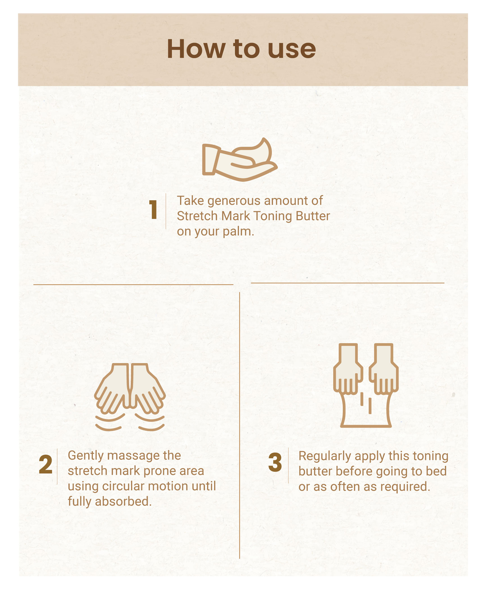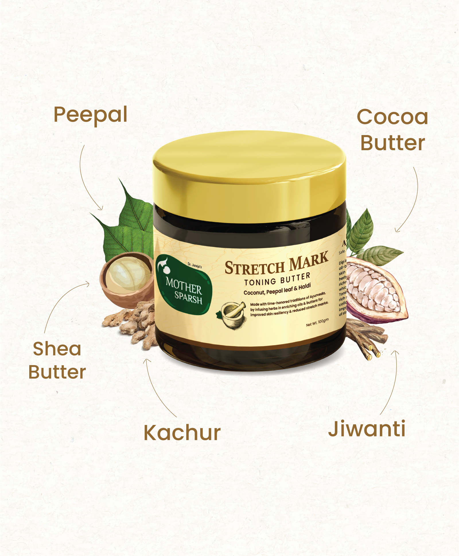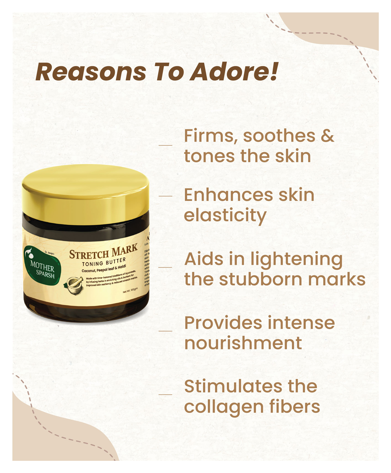 Ever wished there was a way that might help in preventing stretch marks to appear. Mother Sparsh Stretch Mark Toning Butter, a nourishing blend of 14 Ayurvedic herbs and oils, comes to the rescue. Made from the fast-absorbing formulation, it helps restore the skin’s elasticity and hence lightens stretch marks & scars. The goodness of Coconut, Cocoa Butter, Shea Butter, and miraculous herbs like Turmeric help in lightening the stretch marks, leaving the skin supple and hydrated. Composed of beneficial compounds that help to regenerate and nourish skin cells, this toning butter targets the stretch marks that appear on the skin during pregnancy or weight training. Moreover, it works as an emollient that can help to smoothen and soften the skin. The oil-blend butter has a non-greasy texture that stimulates the collagen fibers to restore your skin’s firmness, enhancing skin resiliency.