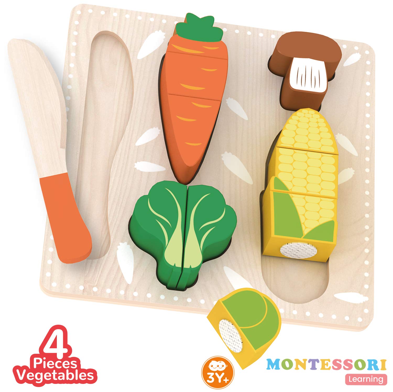 - Cute Vegetables: Cute colourful Vegetables with no sharp edges can be divided into pieces with the help of a wooden knife