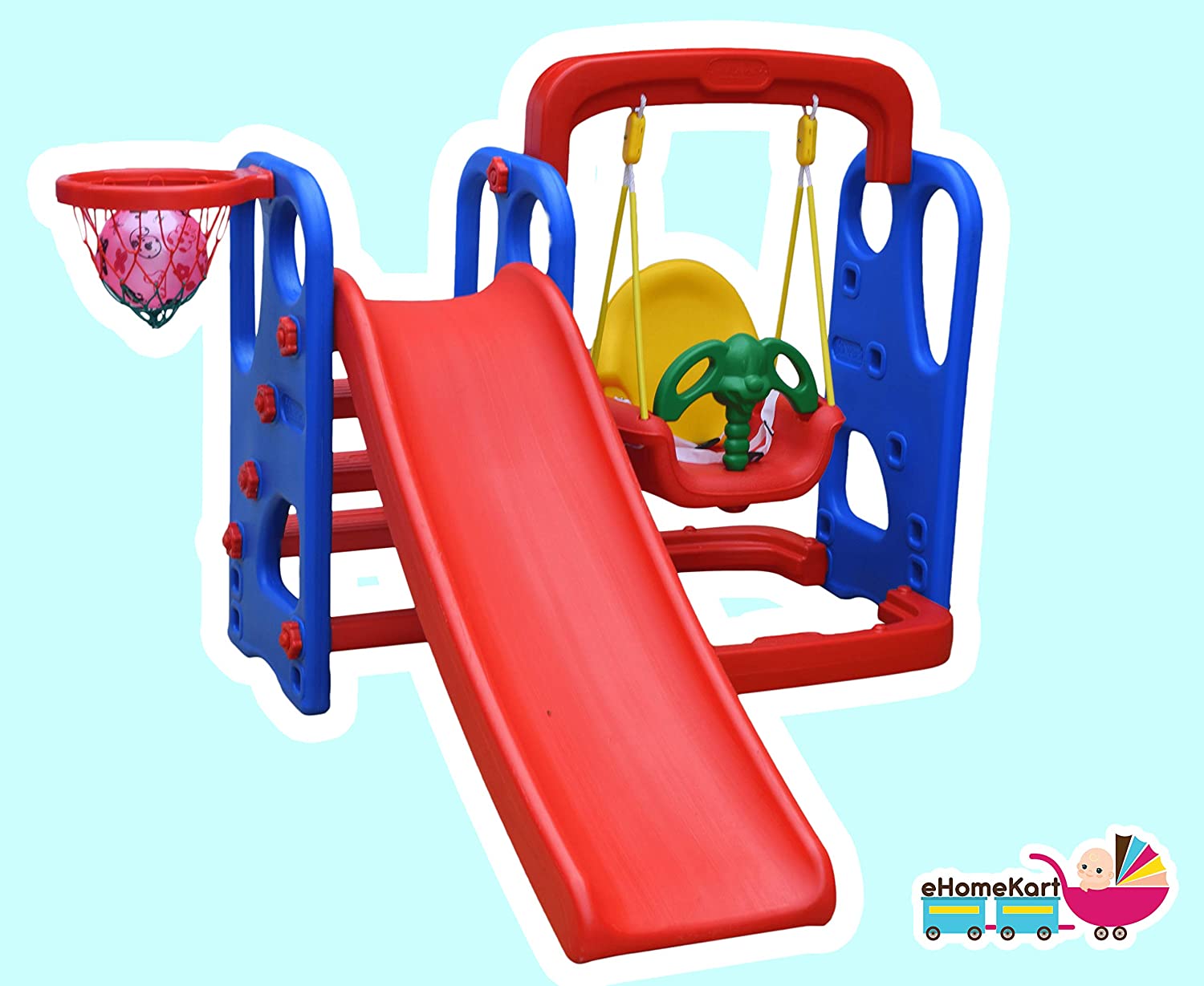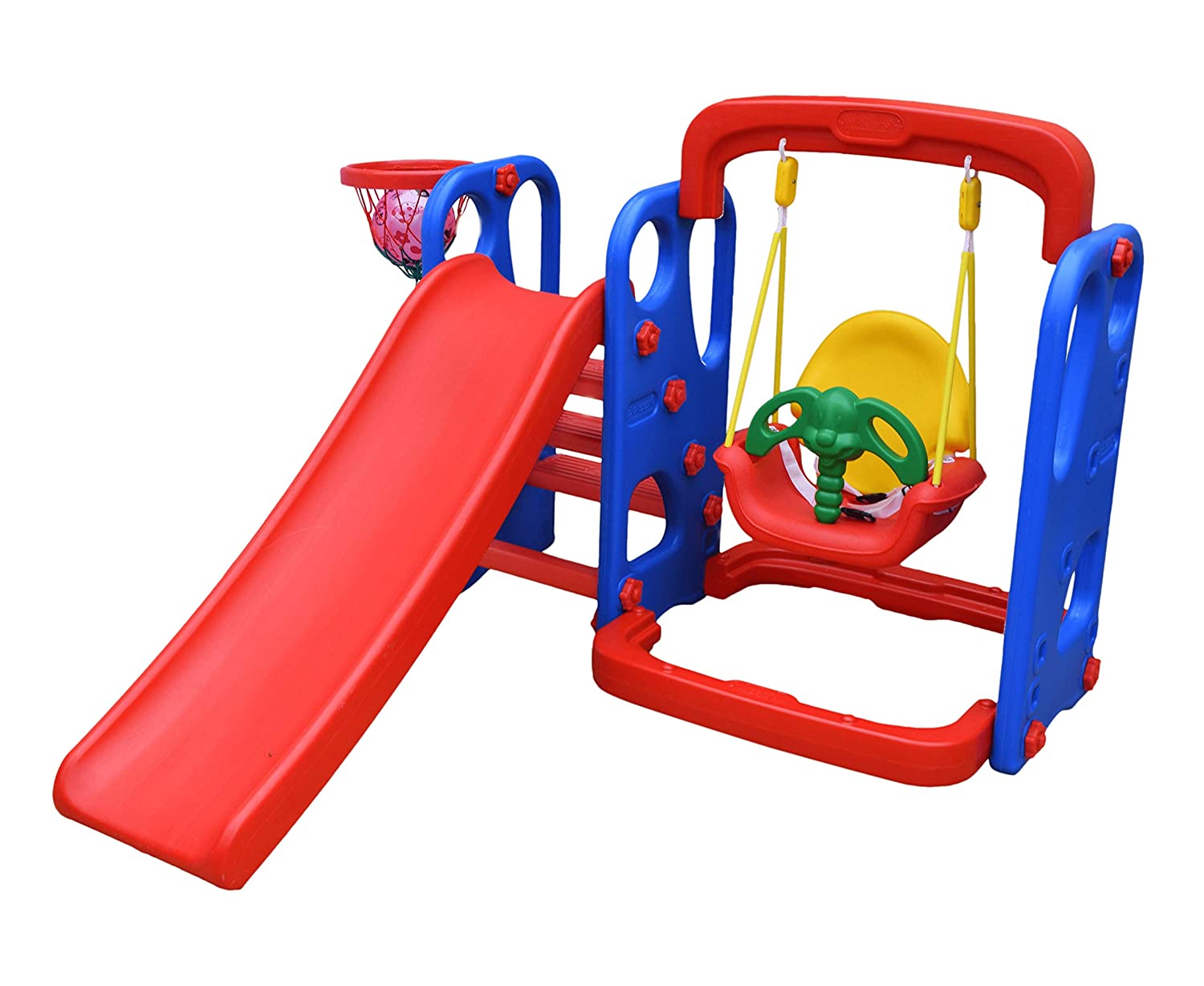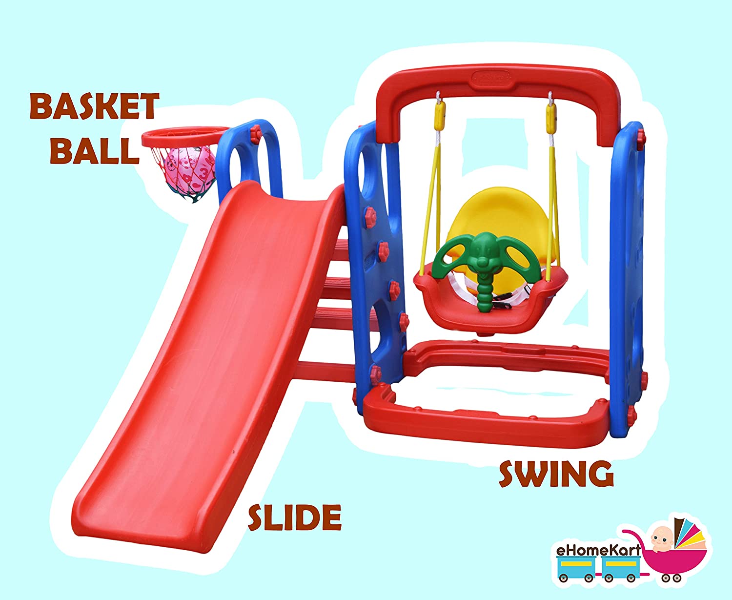 One Slide With SwingSlide with swing and basket ball on a side. Fun filled entertainment for your kids has an appealing design with vibrant colour combinations children can climb up the ladder on one side and slide down the other Kids can crawl in and out through the opening door, window or tunnel and make the fun activity their own hide-away.