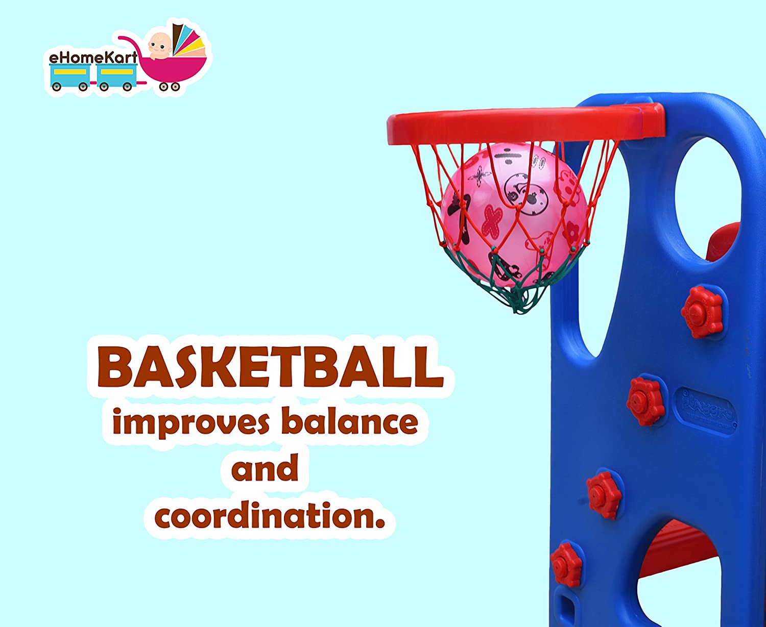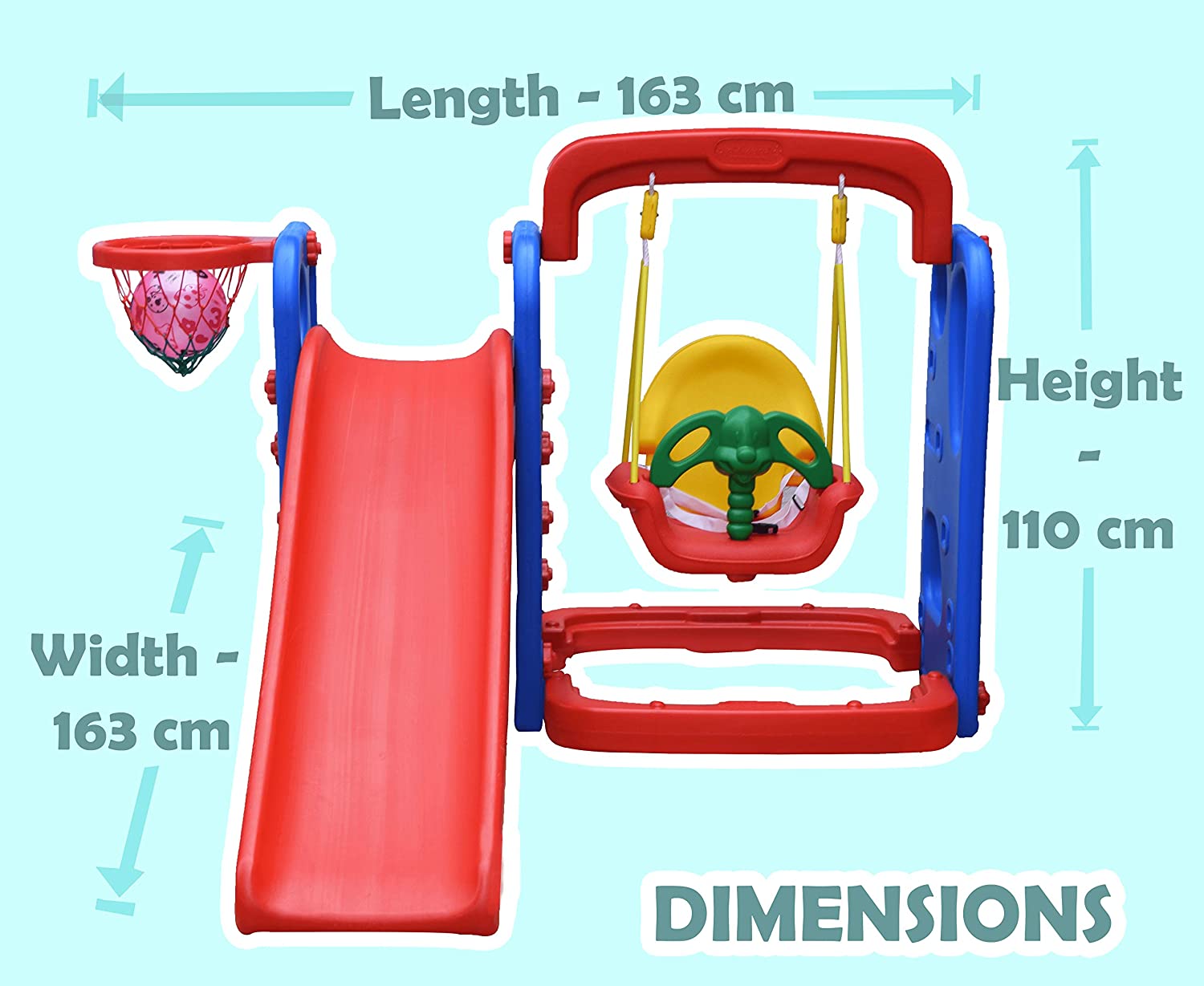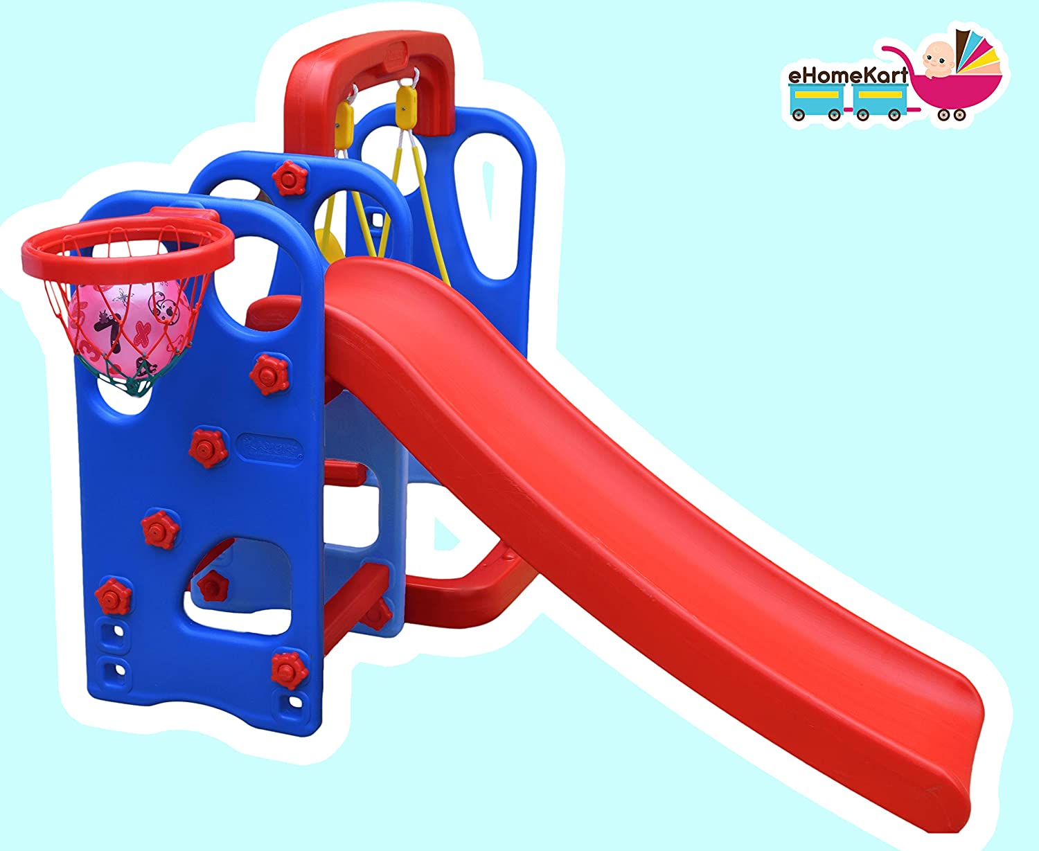 One Slide With SwingSlide with swing and basket ball on a side. Fun filled entertainment for your kids has an appealing design with vibrant colour combinations children can climb up the ladder on one side and slide down the other Kids can crawl in and out through the opening door, window or tunnel and make the fun activity their own hide-away.