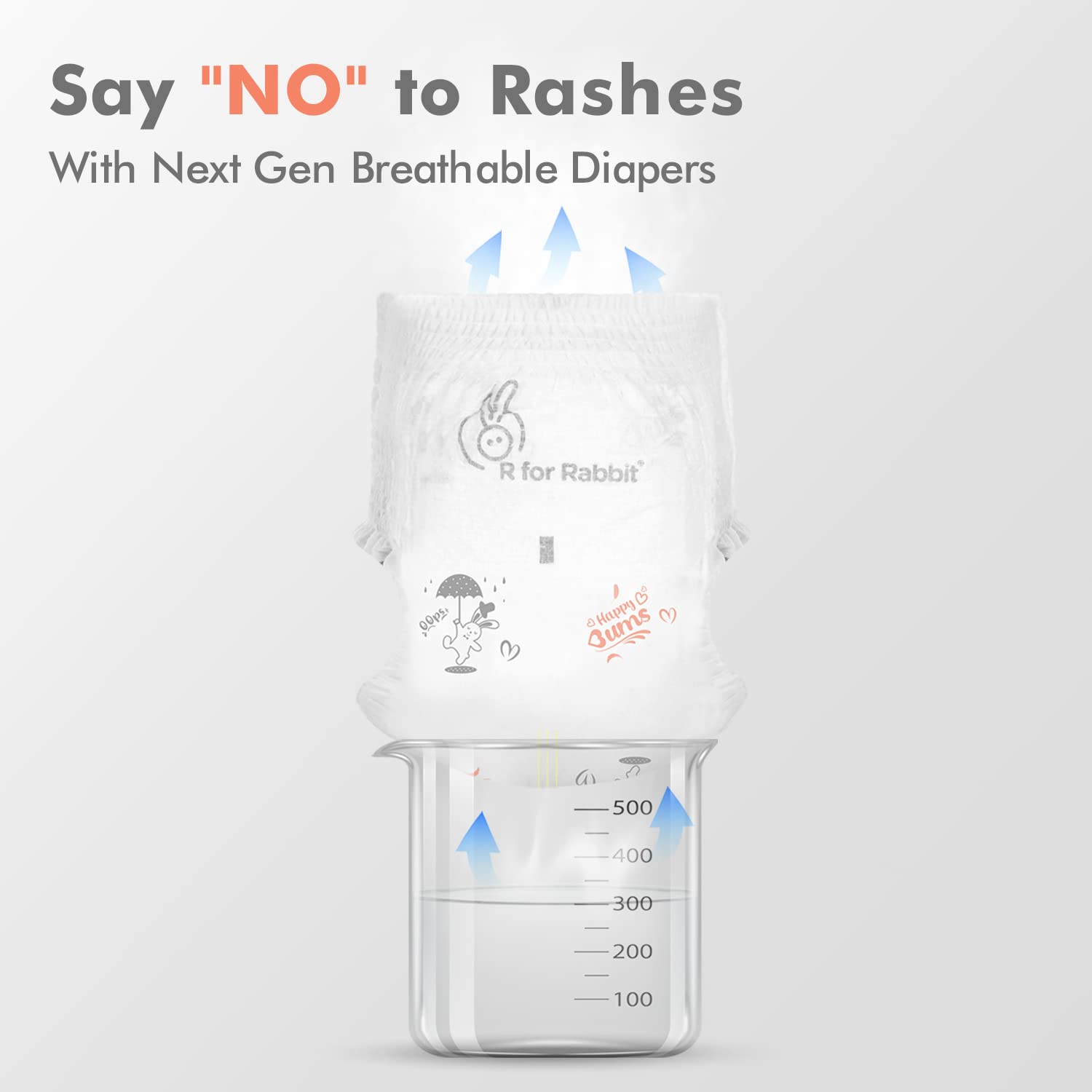 - Breathable Diapers: R for Rabbit Feather Diapers for XL Size having 10 Million* Breathable pores which allows the air to easily pass through, making the diapers highly breathable and acting as a rash guard for your baby by instantly locking moisture in.